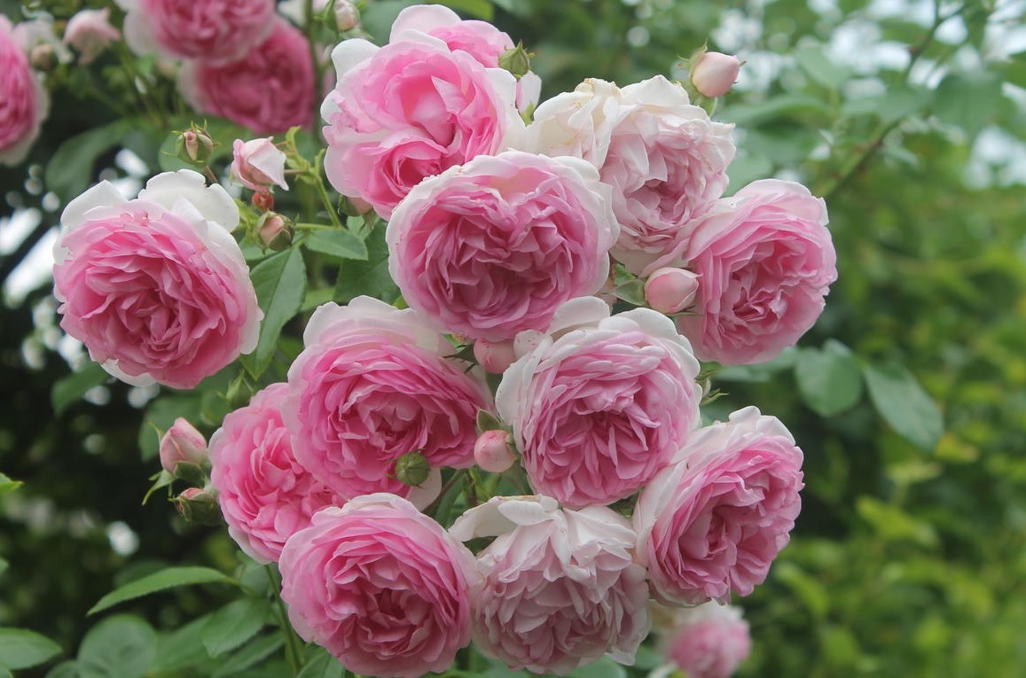 Цветки Жасмины имеют насыщенный розовый оттенок и собраны в крупные кисти, что создает эффект пышного цветочного облака. Лепестки махровые, что придает цветам дополнительный объем и текстуру. Период цветения продолжается с начала лета до поздней осени, обеспечивая продолжительное наслаждение красотой этого растения.