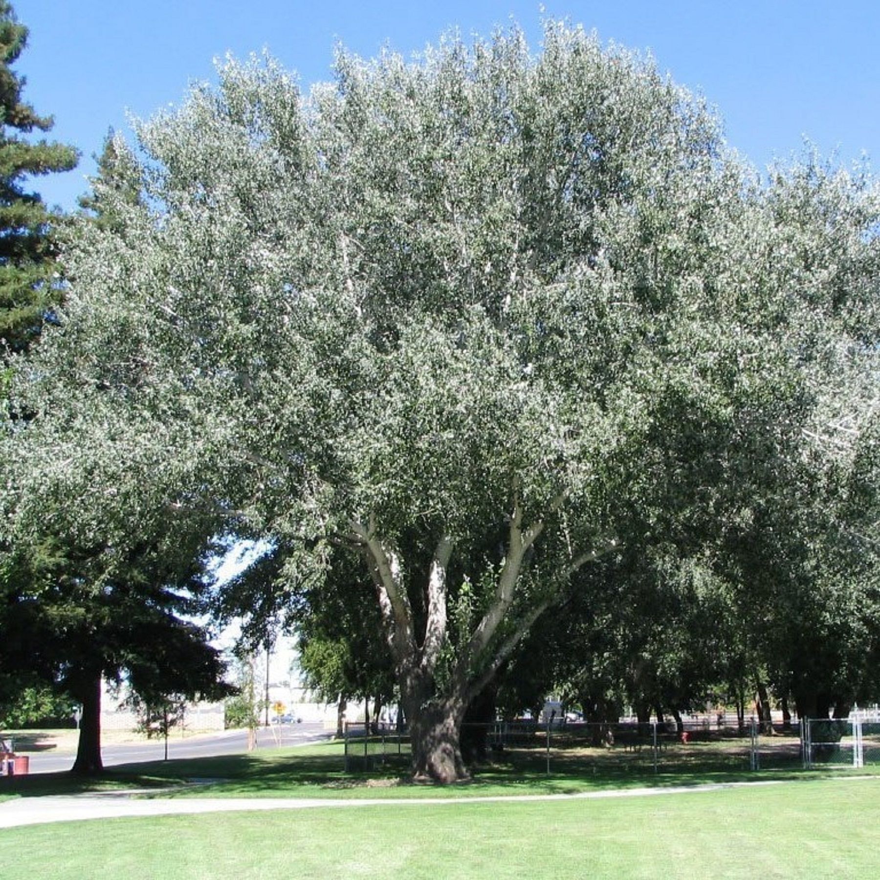 - Листва: Листья тополя Серебристого имеют уникальный серебристо-белый оттенок, который придает дереву особую декоративность. Летом они зеленые сверху и белые снизу, создавая эффект мерцания на ветру.